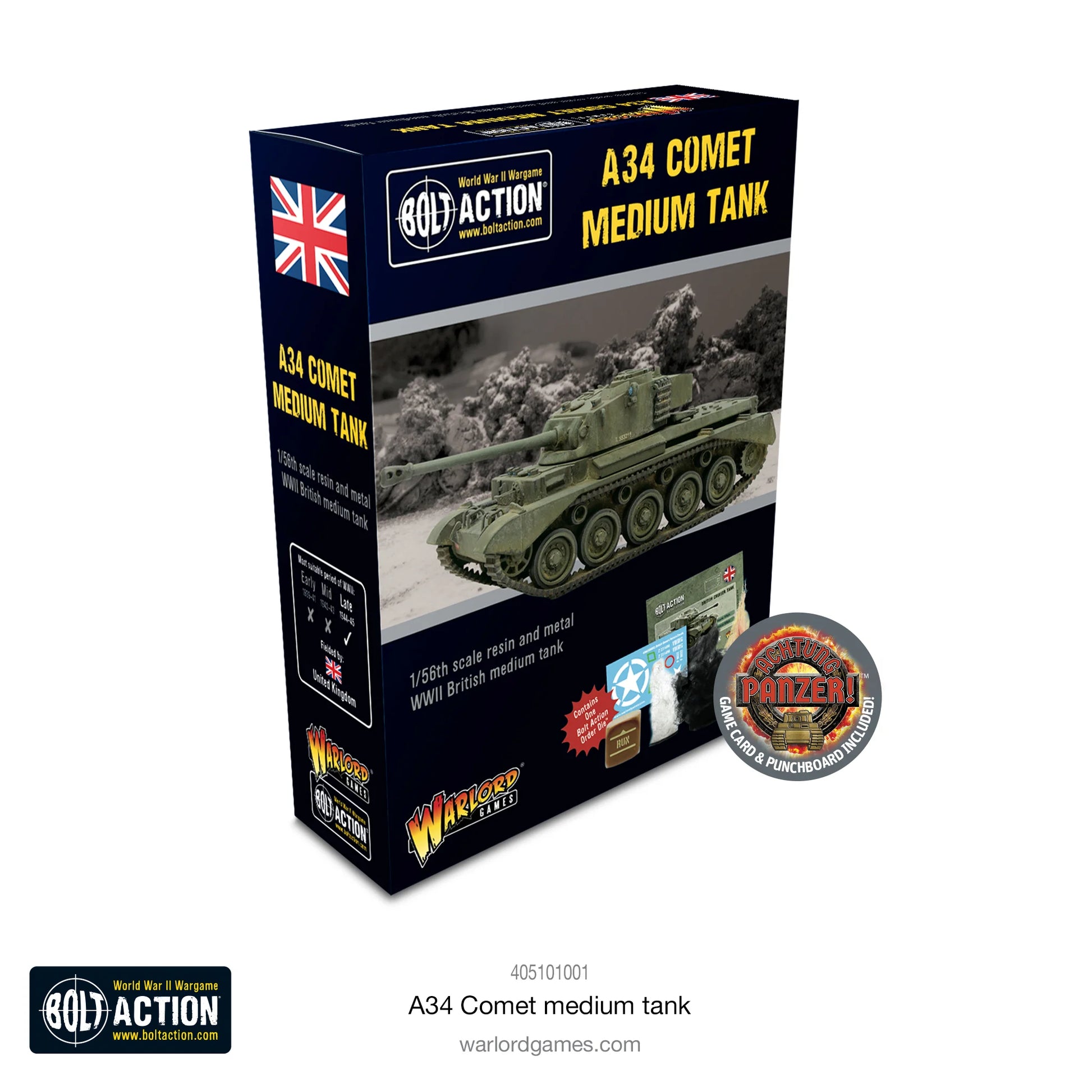 Box contains one resin and metal A34 Comet tank, Bolt Action Order Dice, waterslide decals, Bolt Action: Third Edition stat card, and Achtung Panzer! Tank Datacard and tokens.