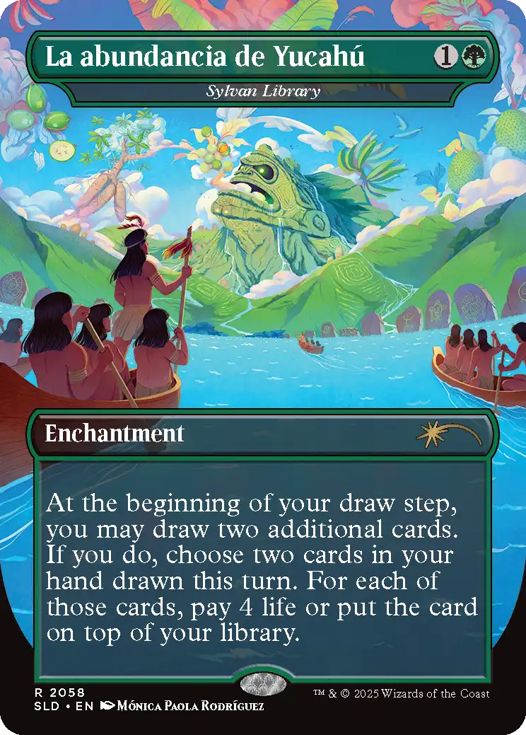 In the spirit of authenticity and creative immersion, we wanted to do something special with this drop. You'll see alternate names in Spanish and Portuguese on select cards, such as "La abundancia de Yúcahu," or as you might know it, Sylvan Library. Additionally, we'll be selling two different versions of this drop. One is printed with Spanish and Portuguese rules text. The other is printed with English rules text. Both versions of the drop will be available in non-foil and rainbow foil.